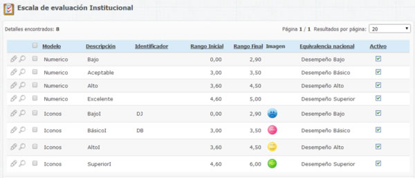 La escala de calificación le permitirá definir los modelos de calificación que desea emplear en la institución y para cada una de las asignaturas, pasando desde la escala numérica definiendo los rangos correspondientes y su equivalencia con la escala nacional, hasta el modelo cualitativo o icónico definiendo imágenes para representar a cada una de las escalas.